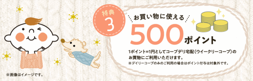 さらに、コープデリのお買い物で使えるポイントも500円分もらえます。