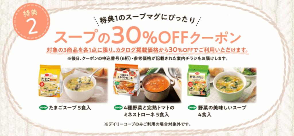 そして、今回はコープで人気のスープ3種で使える30%OFFクーポンがもらえます!