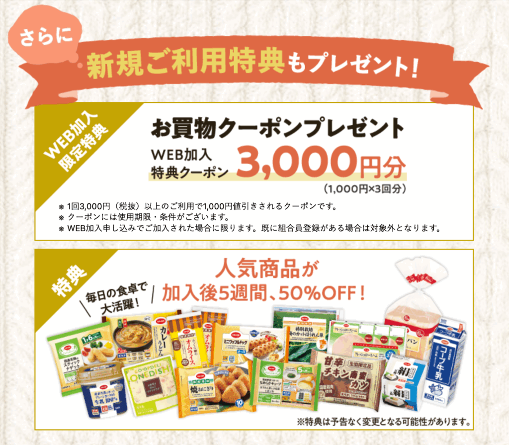 3,000円分のお買い物クーポンはWEBから申込んだ方の限定特典です。ホームページからの加入が1番お得なので、必ず以下の赤いボタンから専用ページにアクセスして申込んでくださいね!